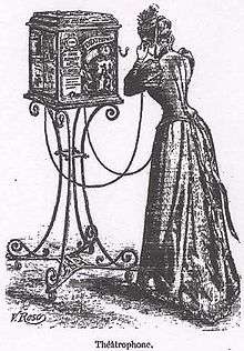 Théâtrophone teknolojisi Belçika'da 1884'te, Lizbon'da 1885'te kullanıma sunuldu. İsveç'te telefon üzerinden yapılan ilk opera yayını Stockholm'de Mayıs 1887'de gerçekleştirildi. İngiliz yazar Ouida 1897 tarihli Massarenes romanındaki bir kahramanı şöyle anlatıyordu: "Dünyanın modern kadınlarından biri. Bir zırh kadar masraflı ve bir theatrophone kadar karmaşık."[5]