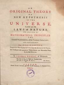 Thomas Wright (1711 - 1786) İngiliz astronom, mimar ve alet üreticisi. Evren üzerine hipotezler konusunda yazdığı “An original theory or new hypothesis of the universe (Une théorie originale ou une nouvelle hypothèse sur l'univers)”başlıklı, 1750'de yayımlanan eseriyle ün yapmıştır. Bu eserinde Samanyolu görünümünün optik bir etkiye bağlamaktaydı. Bu fikri sonradan Emmanuel Kant tarafından geliştirildi. Wright Byers Green’de doğdu. Sunderland okulunda matematik ve seyir bilimlerini öğrendi. Daha sonra Westerton’da küçük bir gözlemevi inşa etti.